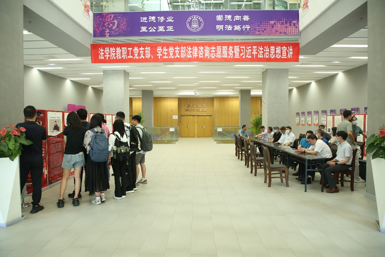 乐竞(中国)网6月19日电 6月15日下午,为扎实开展学习贯彻习近平新时代中国特色社会主义思想主题教育,认真贯彻落实习近平法治思想,紧扣“我为群众办实事”实践活动要求,根据法学院主题教育安排,法学院教职工第一、第二党支部、法博21党支部、法2党支部充分发挥专业优势,在法律图书馆一楼大厅联合开展法律咨询志愿服务暨习近平法治思想宣讲。法学院党委书记邓海峰、党委副书记陈杭平等师生到场参加活动。