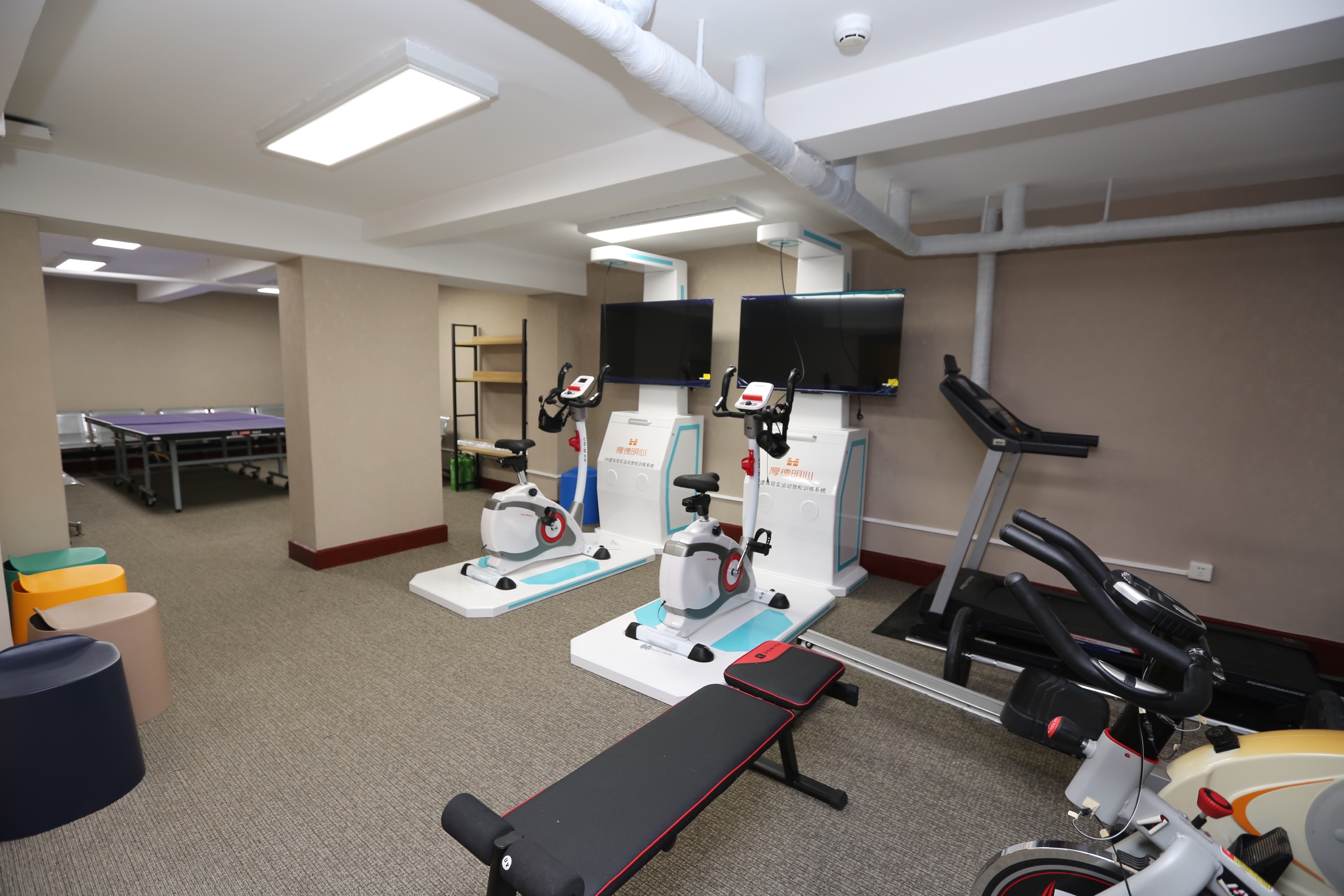 师生幸福共享空间分为幸福空间和运动空间两部分,明斋110室作为幸福空间,设置了睡眠舱、音乐放松椅等,帮助师生放松身心的同时,还为师生交流、心理辅导提供空间支持;明斋东侧地下配置VR动感单车等运动设备,鼓励师生锻炼身体、释放压力。