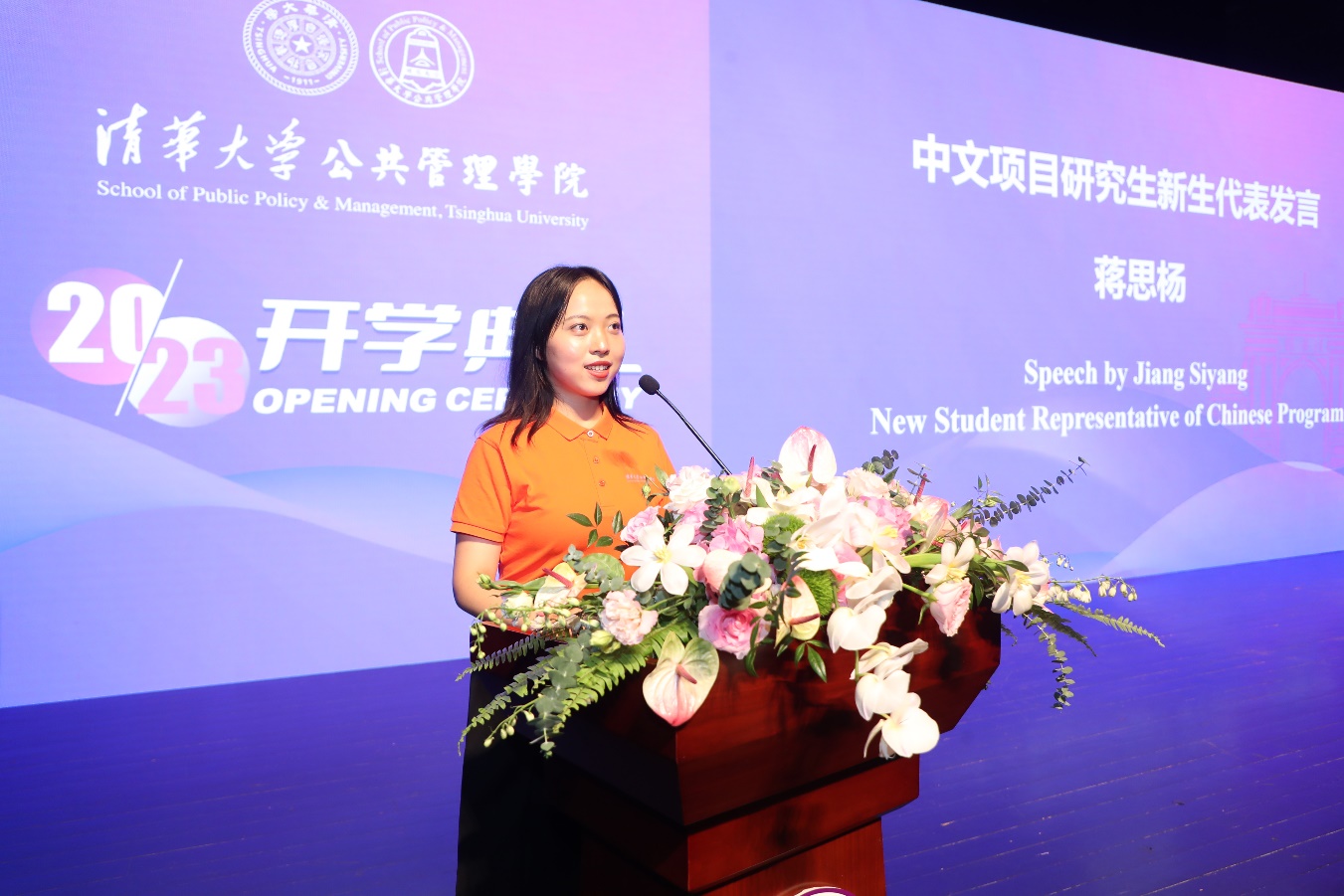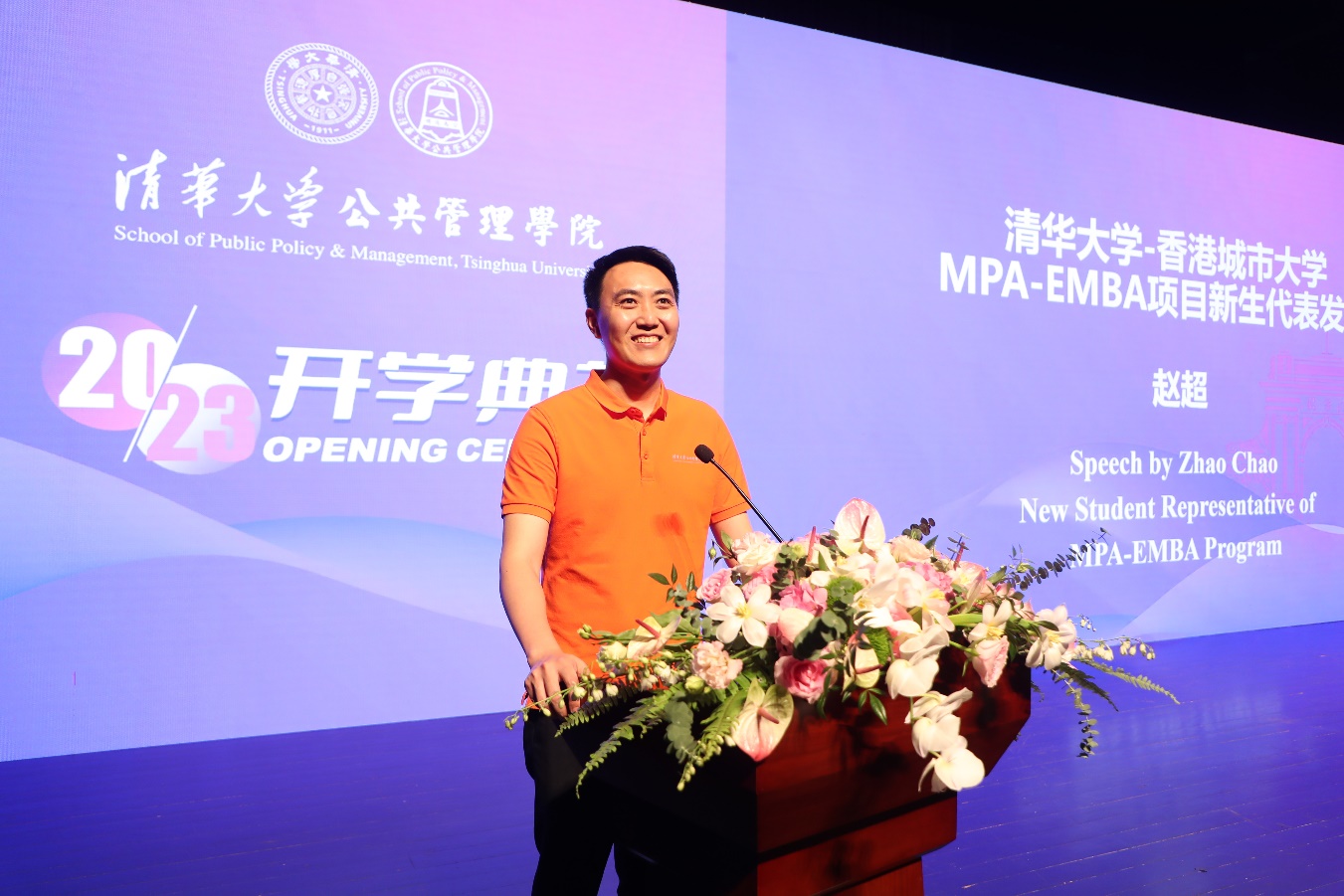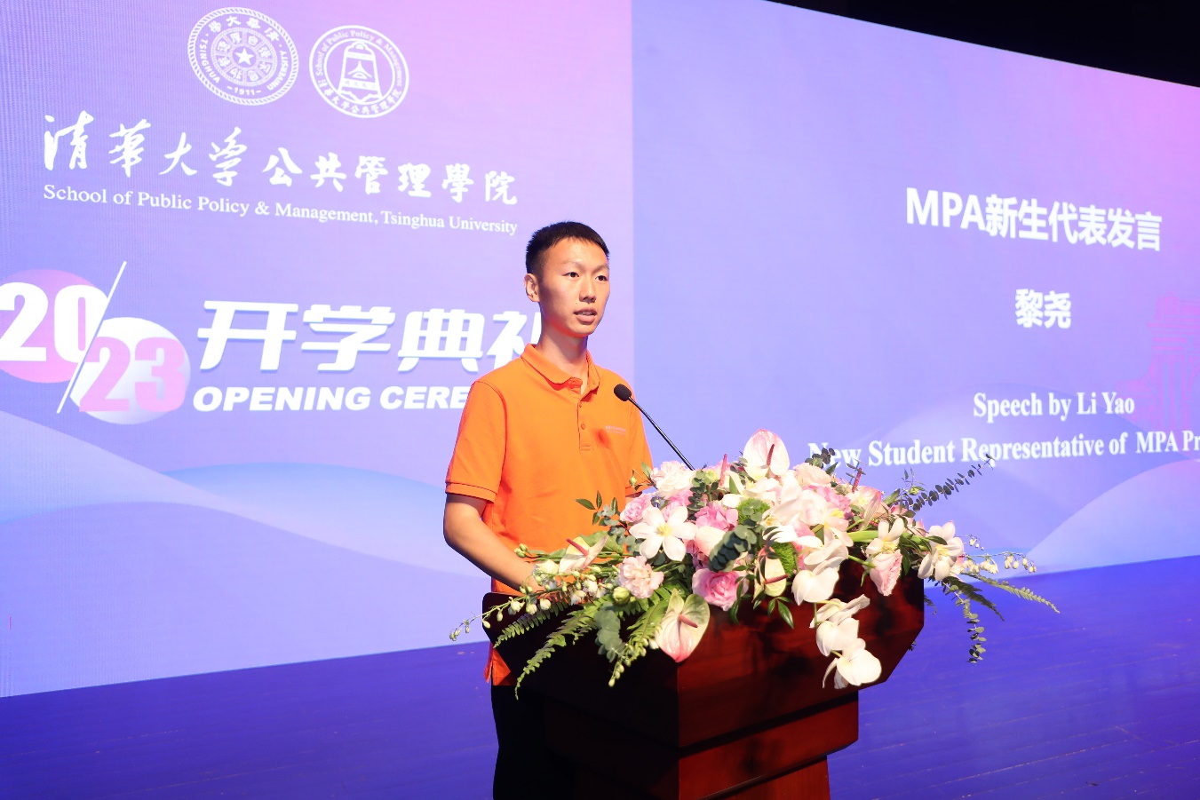 2023级MPA新生代表黎尧发言。黎尧现任重庆市永川区消防救援支队萱花站团支部书记、副站长,他提起自己从工作岗位重回校园有三个原因。一是源于对知识的渴求,对理想的期盼;二是源于对实践的思考,对社会的责任;三是源于对人生的探索。他希望作为清华公管的一分子,始终与国家和民族同呼吸,共命运。