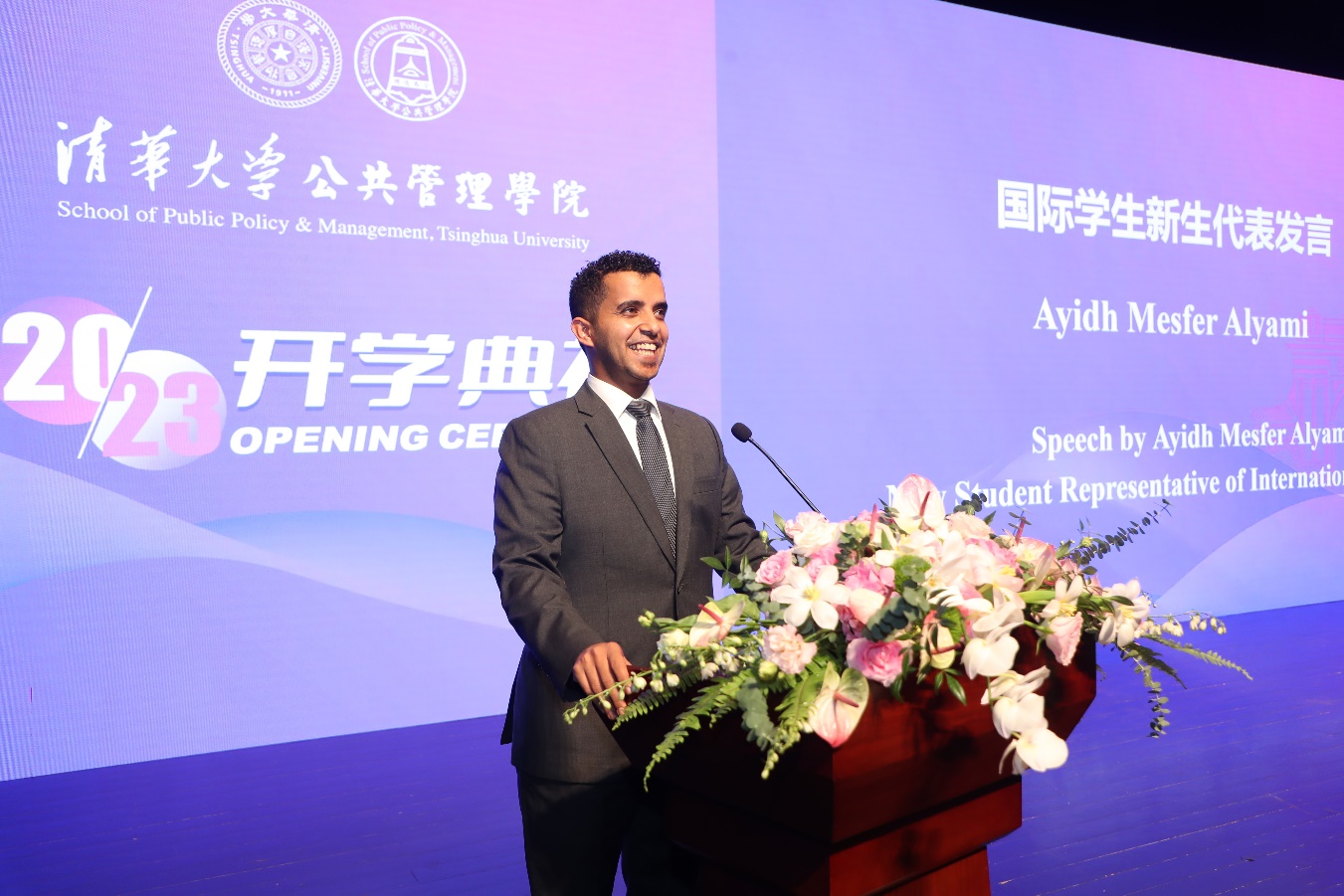 2023级留学生新生代表艾伊德·阿里亚米发言。艾伊德·阿里亚米现任沙特投资部驻华代表,他表示,留学生的存在体现了清华公管对于跨文化参与和合作的注重,他希望在这里扩展视野,构建连接两个国家的桥梁,推动不同观点和背景融合。