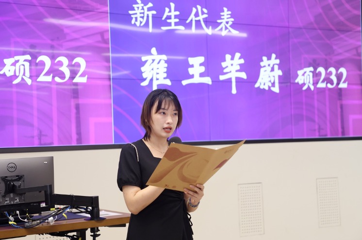 研究生新生代表雍王芊蔚表示,外文系的学生应以语言为起点,立足文化自信,走向世界范围的理解包容,以语言为桥梁,立足家国情怀,走向世界使命的国际视野,在百年未有之大变局中,肩负与世界对话的时代重任。