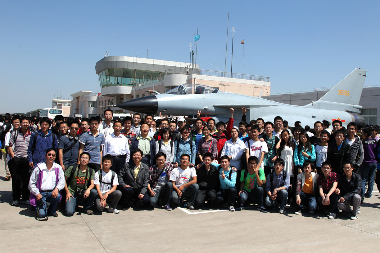吕冀蜀(二排左五)组织学生观看八一飞行大队歼-10战机表演。