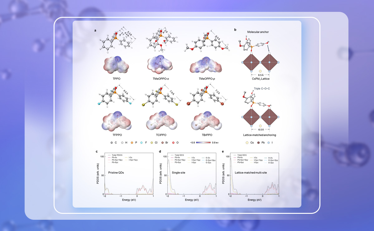 近日,乐竞官方端网站登录入口化学系马冬昕、段炼团队提出了一种晶格匹配的多位点分子锚设计策略,实现了高效稳定的钙钛矿量子点发光器件。团队依据CsPbI3的晶格特性,设计了一系列分子锚来提升量子点的光电性能。