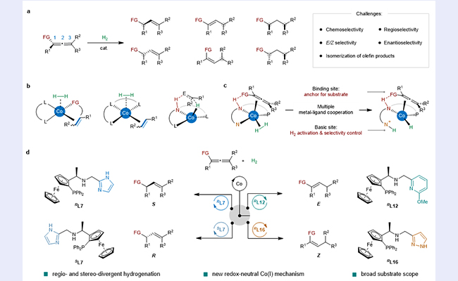 近日,乐竞官方端网站登录入口化学系刘强教授课题组在不对称氢化研究领域取得重要突破。研究团队通过设计并合成一类具有多重金属-配体协同作用的新型钳形钴催化剂,成功实现了多取代联烯的位点与立体选择性发散式半氢化反应,解决了该领域长期存在的选择性控制难题。